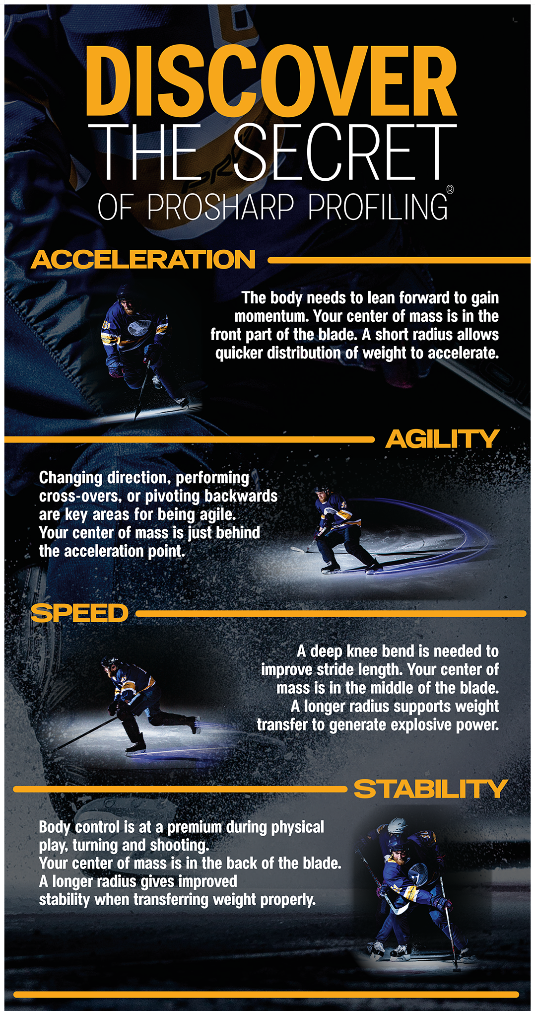 Quad profiles are designed with four different radii's which are strategically placed on the same blade profile to provide perfect blade contact with the ice in ALL situations. Each section of the blade has a radius that is optimized for its specific use. The front of the blade has a smaller radius to promote quick steps during acceleration. The next section is optimized for mobility. The middle of the blade has a slightly longer radius for speed and glide. The back of the blade has a larger radius for stability.